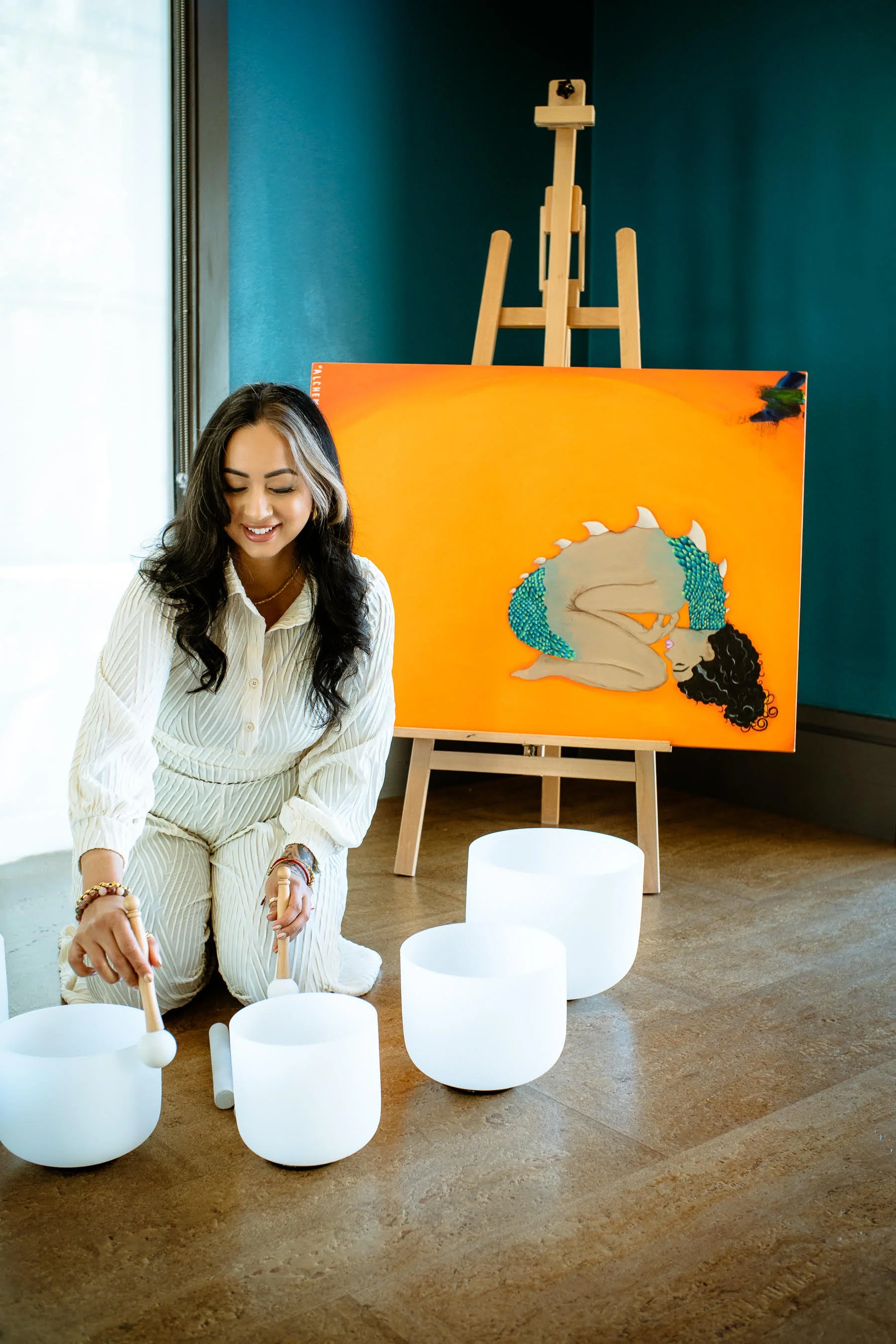 Her abstract art, murals, and wellness offerings are woven from the same intention: to help people feel seen, supported, and restored. Through color, breath, and sound, Veronica creates spaces where healing meets creativity and where personal transformation becomes possible.